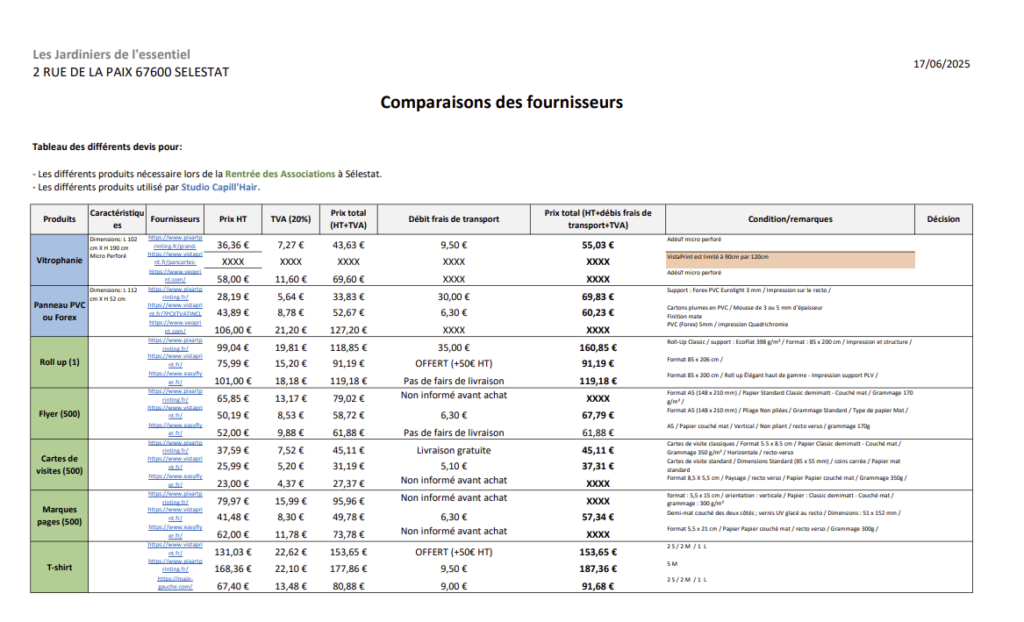 Réalisation d'un tableau de comparaison de différents fournisseurs lors pour imprimer nos différentes supports de communication